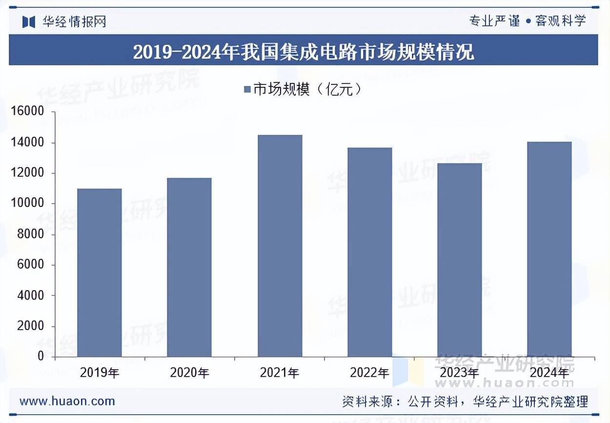 近年来,我国政府和企业对集成电路技术创新和研发持续增加投入,在芯片设计、制造工艺、封装测试等方面取得了重要突破和进展。我国集成电路市场规模持续扩大,已成为全球最大的集成电路市场之一。据统计,我国集成电路市场呈复苏态势,2023年中国集成电路市场规模为12672.9亿元,2024年规模回到约14042.5亿元,同比增长约10.81%,随着我国消费电子、通信、汽车电子等下游市场对集成电路的需求强劲,支持我国集成电路行业保持增长态势。
