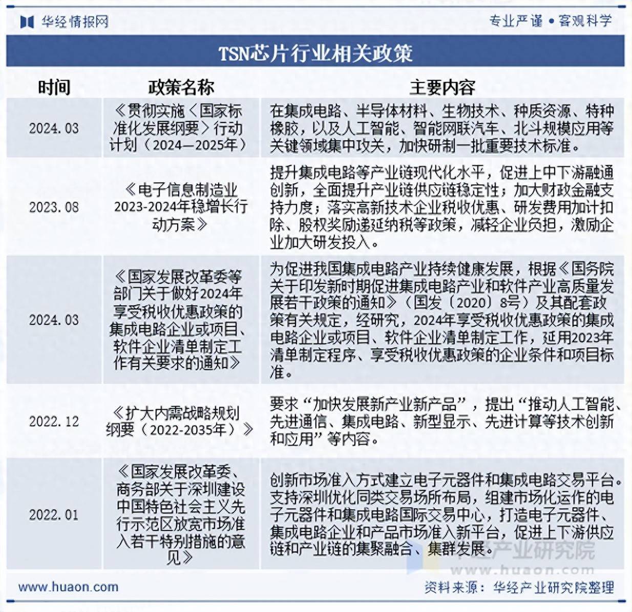 一系列政策法规的支持保证了国内集成电路行业较高的景气度,为集成电路行业发展在政策层面从产业引导、财税和融资等方面持续注入动力,进一步强调并巩固了集成电路行业的战略性地位,为国内集成电路行业的蓬勃发展营造良好的环境,营造了有利于TSN芯片行业发展的外部环境,对行业未来发展起到了积极的促进作用。