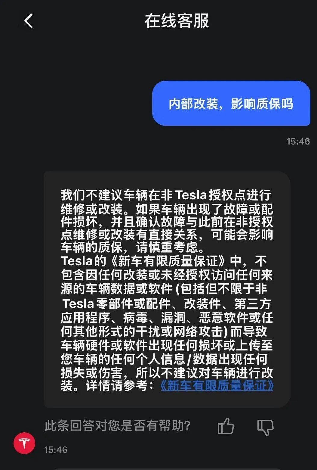 记者从特斯拉官方在线客服处得知,任何非官方改装都会导致整车质保失效,同时可能引发安全隐患。